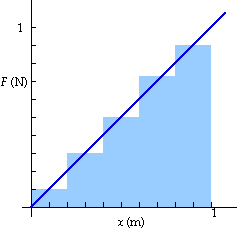 The approximation means that we calculate the work done in compressing the spring by the stair-stepped light blue area on the graph, rather than the area under the dark blue line. The total work done is (1/2) k x2 which, in this case, is the same as the stair-stepped area. It works out to 0.5 J of energy. At each step along the way the work done is taken from the moving objects kinetic energy and transferred to kinetic energy in the spring. The following table shows the calculation step-by-step.