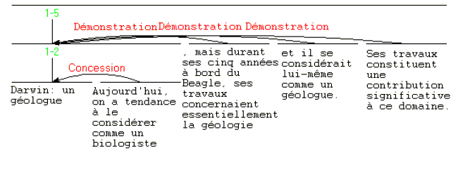 Puisque l'effet n'est jamais absent, toute observation d'une relation impute une intention à l'auteur quant aux segments de textes joints par la relation. Dans une analyse donnant un rôle à tout segment, cette méthode revient à attribuer une intention, une raison à la présence de chaque élément du texte. Un observateur examine le texte et relève des combinaisons cohérentes de segments et de relations (et d'autres structures) qui englobent la totalité du texte. A un texte peut correspondre plus d'une analyse, que ce soit parce que l'observateur trouve une ambiguïté ou parce qu'il considère qu'une analyse non-déterministe rend mieux compte de l'intention de l'auteur. Souvent, une telle analyse ne formera pas un arbre, mais les analyses multiples sont plutôt rares. Les définitions abrégées sont destinées à clarifier le statut épistémologique des observations. Il faut néanmoins tenir à l'esprit que, pour chaque constatation de l'observateur, celui-ci déclare que "Il est plausible pour l'observateur qu'il était plausible pour l'auteur rédigeant le texte que la constatation est valable". Le principe qui a motivé l'organisation et le niveau de détail des définitions était d'assurer que le processus d'observation puisse toujours être mené à bien. Exemple de l'analyse de "Darwin", avec les affirmations Voivi un exemple d'analyse du résumé d'un article du Scientific American (Mai 1986), intitulé "Darwin : un géologue". A fins d'analyse, le résumé a été pré-divisé, sur une base syntaxique, en cinq unités (le titre étant considéré comme une unité). 1) Darwin : un géologue 2) Aujourd'hui, on a tendance à le considérer comme un biologiste, 3) mais durant ses cinq années à bord du Beagle , ses travaux concernaient essentiellement la géologie 4) et il se considérait lui-même comme géologue. 5) Ses travaux constituent une contribution significative à ce domaine. Le diagramme RST se présente comme ceci. Affirmations de l'Observateur: Le tableau suivant présente les affirmations effectuées par l'observateur, qui établit la première relation de Démonstration dans l'exemple "Darwin".