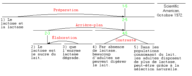 Qu'est-ce qu'une analyse? Le processus d'analyse a pour but de fournir à une personne qui comprend le texte une méthode structurée, précise, pour déterminer une partie de ce qui sous-tend la compréhension. L'analyste (généralement appelé l'observateur dans les articles sur la RST) déclare que, de son point de vue, les deux premières unités (celles qui expliquent les termes lactose et lactase) ont pour but de faciliter la compréhension du reste du texte. Également, que l'unité 2) donne un détail supplémentaire sur le contenu (ou, plus généralement, la situation) présenté dans l'unité 1). Enfin, que les unités 3) et 4) sont en relation neutre de contraste. Chacune de ces observations est formulée en termes d'intention de l'auteur: ainsi, par exemple, l'intention de l'auteur est que le lecteur reconnaisse que les situations exprimées dans 3) et 4), identiques à plus d'un titre, diffèrent d'une manière que l'auteur souhaitait précisement formuler. Rien dans la RST n'oblige l'observateur à attribuer un rôle structurel à tout élément du texte. Néanmoins, pour les textes rédigés avec soin, à virtuellement tout texte correspond une analyse RST fournissant une place structurelle à tout élément du texte. (Parfois, en raison de la complexité du texte ou de son ambiguïté, l' observateur peut effectuer plus d'une analyse.) D'autres relations Voici un ensemble de relations (qui s'ajoutent à celles données ci-dessus.