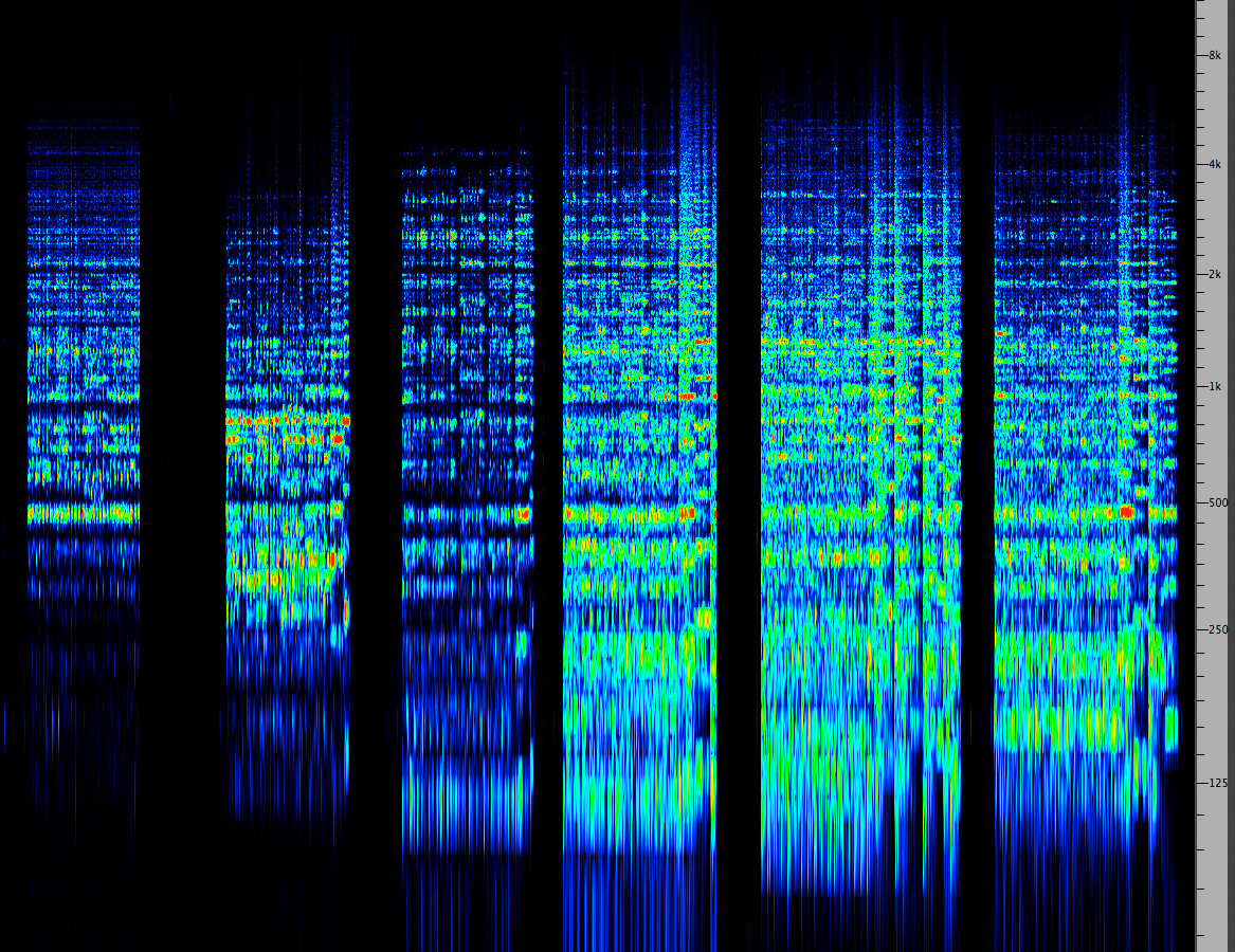 Spectrogram of excerpts of the six audio examples, click to enlarge