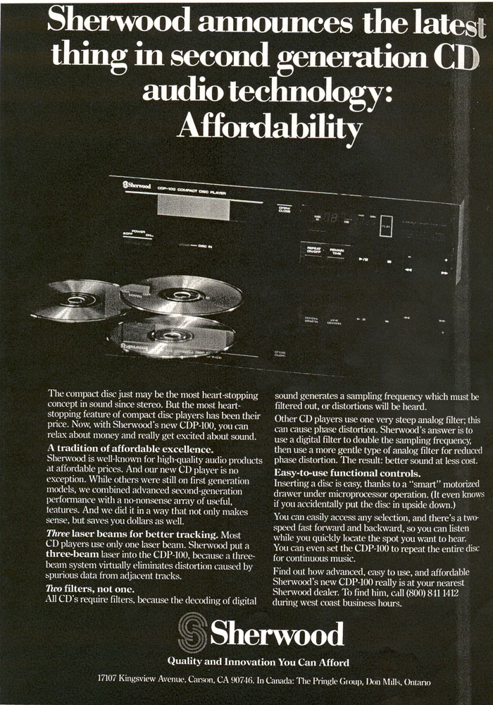 Sherwood ".. the latest thing in second generation CD audio technology: Affordability", Sept. 1984