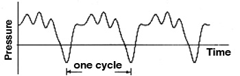 - this waveform above is periodic, and one cycle is marked out, but it looks like it is repeating exactly, whereas all acoustic sound, even when periodic, will have some variations in each period; if you were to hear this sound, it would seem very synthetic and artificial, but it would have a defined pitch as described below