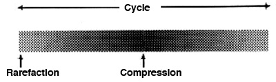 Here the increases and decreases in sound pressure are shown above as lighter and darker regions (called rarefactions and compressions, respectively) which occur in the same direction as the propagation of the wave; hence this is an example of a longitudinal wave, a little like what might occur in a coiled spring (think of a "Slinky"!)