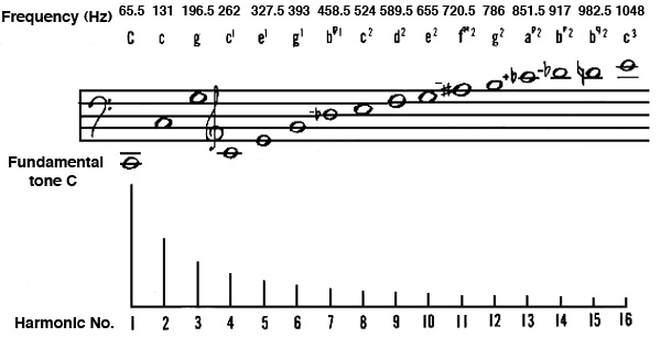 The bottom part of this diagram shows the Harmonic Series as a set of equally spaced frequencies on a linear scale where the distance between them is the same as the fundamental frequency f. That is, the series is f, 2f, 3f, 4f, ... Above that is the musical notation for harmonics based on a fundamental of a low C at 65.5 Hz.