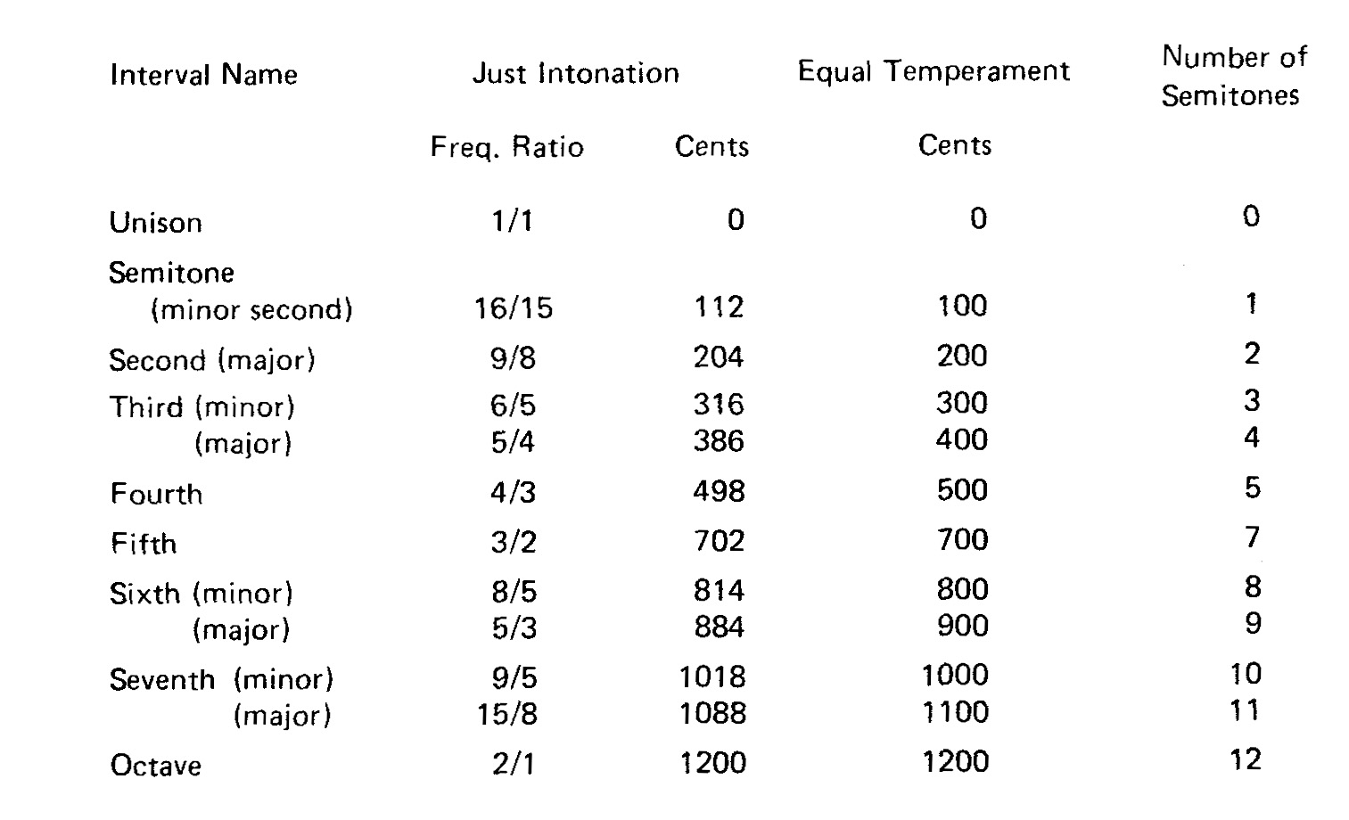 In this chart you can see the set of musical intervals based on ratios in Just Intonation, and their equivalent in cents. In the next column are the same intervals in Equal Temperament, which are neatly arranged in multiples of 100 cents. By using the unit of the cent, we can see that the only interval that is identical in both scales is the octave (2:1). The next interval from the harmonic series, the 5th (3:2), differs by only two cents between the Just and Equal Tempered scales.