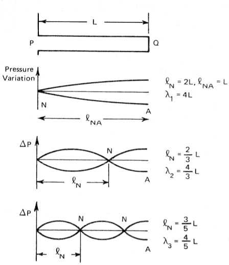 In this configuration each mode of vibration shown above has a node (i.e. minimum pressure) at the open end and an antinode (i.e. maximum pressure) at the closed end. The fundamental mode of vibration is a 1/4 wavelength and therefore has a wavelength 4 times the length of the tube. The next mode of vibration is not the 2nd harmonic, but the 3rd, with a 3/4 wavelength, and next the 5th harmonic with a 5/4 wavelength.