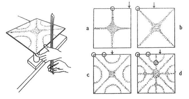 Today, a standard demonstration is to excite the plate with a single frequency tone generator that continually rises in frequency. When it corresponds to a mode of vibration in the plate, the nodal figures suddenly emerge and re-configure themselves.