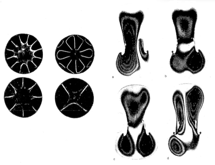 This diagram at left shows some Chladni figures in a circular plate, and at right, dark nodal lines are shown holographically in a violin body. Because of the violin's irregular shape, it exhibits highly complex modes of vibration. This is desirable in an instrument where many pitches need to be resonated, not just a few in the harmonic series, hence the complexity prized in a finely crafted instrument to be complex resonators that provide the rich tone of the instrument.