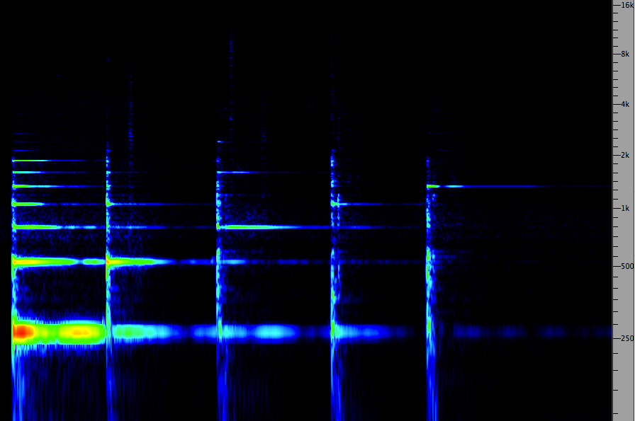 Piano tone (middle C) followed by lightly touching the string to produce harmonics 2, 3, 4 and 5; spectrogram of same