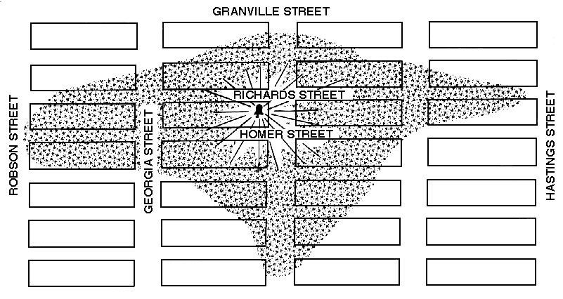 Acoustic space may also refer to the profile of a sound or sound signal over its surrounding environment. The acoustic space of any sound is that area over which it may be heard before it drops below the level of ambient noise. The diagram below shows the area over which the bells of the Holy Rosary Cathedral in Vancouver may be heard, a profile greatly diminished from the early 20th century when they could be heard for several miles.