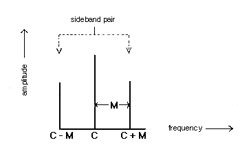 Amplitude modulation spectrum of two sine waves, carrier C and modulator M, showing the addition of a pair of sidebands, C + M and C - M, around the carrier.