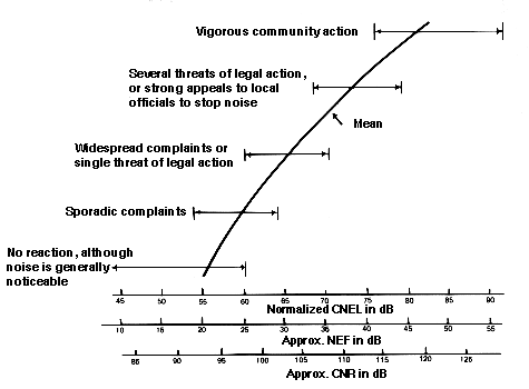 A variation in the calculation uses the first equation above but counts the flights as in the NEF system (without evening specification). The normalized CNEL uses the corrections listed in the table below (see also sound intrusion). Correlation to community reaction is shown in the following chart for the CNEL scale (with approximate CNR and NEF values).