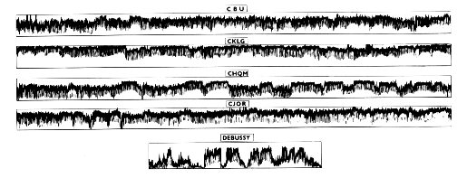 The following chart shows the intensity levels of four AM radio stations in Vancouver over an hour period, where the signal has been compressed to different extents such that the output rides near a maximum level. For comparison, the contours of a work by Debussy are shown.