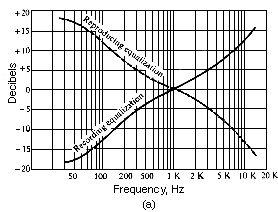 Equalization according to standard curves as shown below establishes the frequency response characteristics for recording and playback of phonograph discs and magnetic tape. The recording characteristic is always the inverse of that of the playback; for example, high frequencies are boosted during disc recording by the same amount that they are attenuated during playback, thus resulting in flat response for the entire operation. 0 dB is set as the output at 1 kHz.