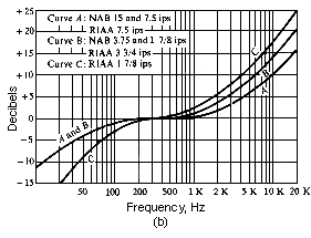 The curves for phonograph recording and playback, adopted in the U.S. and Great Britain in 1953, are known as the RIAA curves of standard equalization. The NAB and RIAA curves for tape recording (which operate in the opposite sense of those for disc with respect to frequency) are also shown. These characteristics are those of the pre-amplifier in most tape recorders.