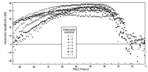The diagram below shows the results of Fourier analysis of every period of a short trumpet tone (0.16 sec. at 550 Hz). The time behaviour of the first seven harmonics is shown from right to left as the sound progresses. At no time is the spectrum perfectly stationary. The greatest variation is during the onset transients shown at the right.