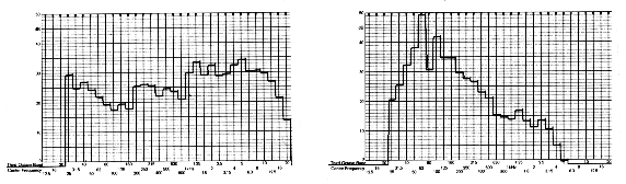Third-octave spectrum analyses of sound sources with high intensities of low frequency energy. Although the infrasonic component cannot be analyzed by the same machine and is not shown here, it is quite possible that such energy exists in the region at the left of the graph, given the high levels from 20-100 Hz.|