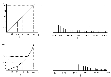 Linear and non-linear relationships (a, b). Graphs (c, d) show a harmonic series spectrum with two different scales on the horizontal axis. With (c) the frequency axis is linear, whereas with (d) the scale is logarithmic, with the result that octave intervals are equidistant and the harmonics are spaced increasingly closer. See: Basilar Membrane.