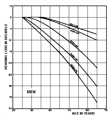 Presbycusis curves for women and men, showing the average threshold shift for pure tones as a function of age (from ASA Subcommittee Z24-X-2, "The Relations of Hearing Loss to Noise Exposure," New York, 1954, pp.16-17).