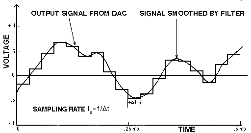 Production of a sound signal by digital synthesis. Numbers stored in the computer's memory are converted to discrete voltage steps by a digital-to-analog converter at fixed time intervals Dt, as shown above, along with the resultant signal smoothed by a low-pass filter.