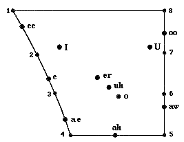 The vowel quadrilateral enclosing all possible tongue positions and on whose boundaries are the cardinal vowels numbered 1 to 8.