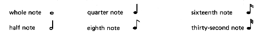 Although sometimes used interchangeably with the expression TONE, especially in North America, the term 'note', strictly speaking, refers to one of a set of signs with which music is notated or encoded. The various rhythmic values of the notes employed in Western music are listed here in a sequence that successively reduces their duration by half: