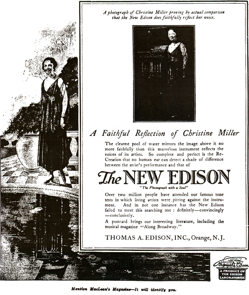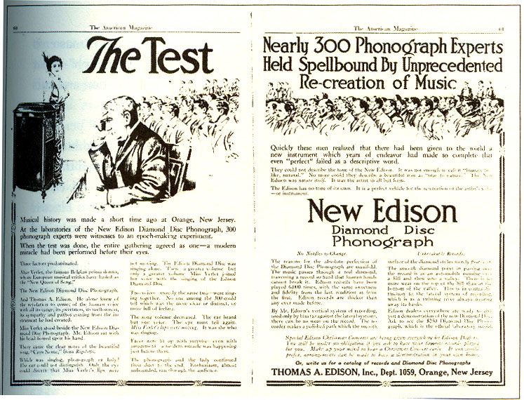 In the following ad, an ensemble of opera singers (all contracted with Edison) try to determine whether the phonograph recording of their female colleague standing beside it at the back, is being heard live or recorded. The male singers in front seem to be pondering the question quite seriously, while the women.... well, you decide.