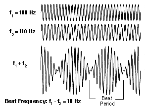 Beats produced by 100 and 110 Hz, with the higher tone gradually reduced to 100 Hz causing the beats to slow down and disappear.