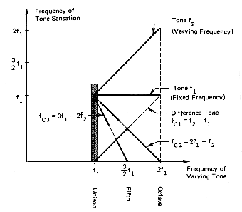 Frequencies of the combination tones fC1, fC2, fC3 evoked by a two-tone superposition of frequencies f1, f2. Heavy lines indicate the most easily detected ranges of the combination tones (from Roederer, Introduction to the Physics and Psychophysics of Music, Springer, 1975, p. 35, used by permission).
