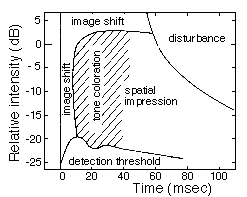 Perceptual effects of a direct sound combined with a reflected sound (at an angle of incidence of 40o) according to the delay time and relative intensity. Very short delays cause an image shift sideways and tone colouration due to phasing; longer delays contribute to a spatial impression of reverberation, and stronger delays greater than 50 ms disturb the sound image and are perceived as echoes (after M. Barron, "The subjective effects of first reflections in concert halls - the need for lateral reflections," Journal of Sound & Vibration, 1971, vol. 15, pp. 475-494.)