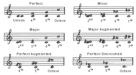 The second, third, sixth and seventh have major and minor forms; the unison, fourth, fifth and octave are called perfect; perfect or major intervals may be augmented (i.e. raised by a semitone); perfect and minor intervals may be diminished (i.e. lowered by a semitone). In 12 tone equal temperament, the augmented fourth and diminished fifth form the interval called the tritone which is comprised of 6 semitones (i.e. a half octave).The following chart shows these intervals in musical notation.