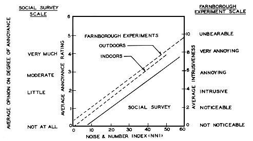 Relations between annoyance rating and Noise and Number Index obtained from social survey and Farnborough experiments. From: Wilson Committee on the Problem of Noise, Noise: Final Report, Cmnd 2056, London, HMSO, 1963, p. 208, used by permission.