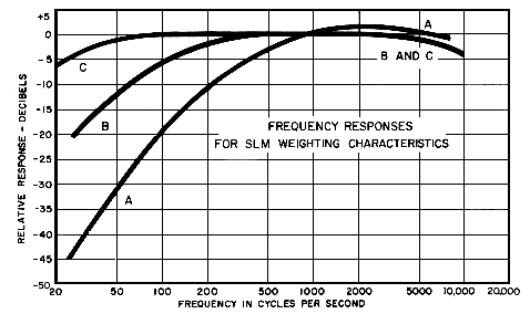 Sound level meter response characteristics for the A, B, and C weighting networks (from Handbook of Noise Measurement, General Radio, 1963, p. 9, used by permission).
