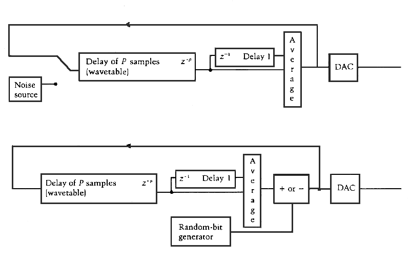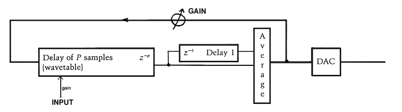 References:Karplus, K. & A. Strong, 1983. Digital synthesis of plucked string and drum timbres. Computer Music Journal, 7(2).