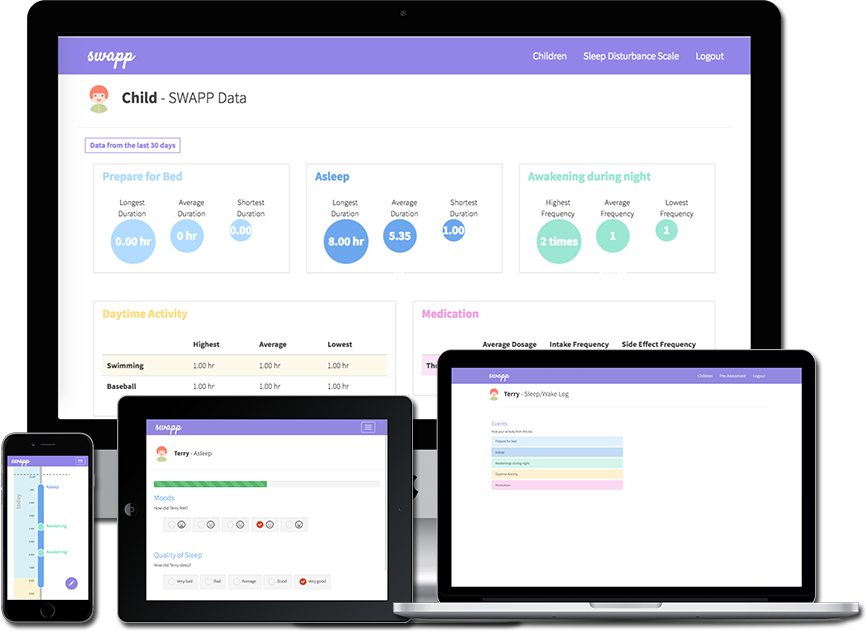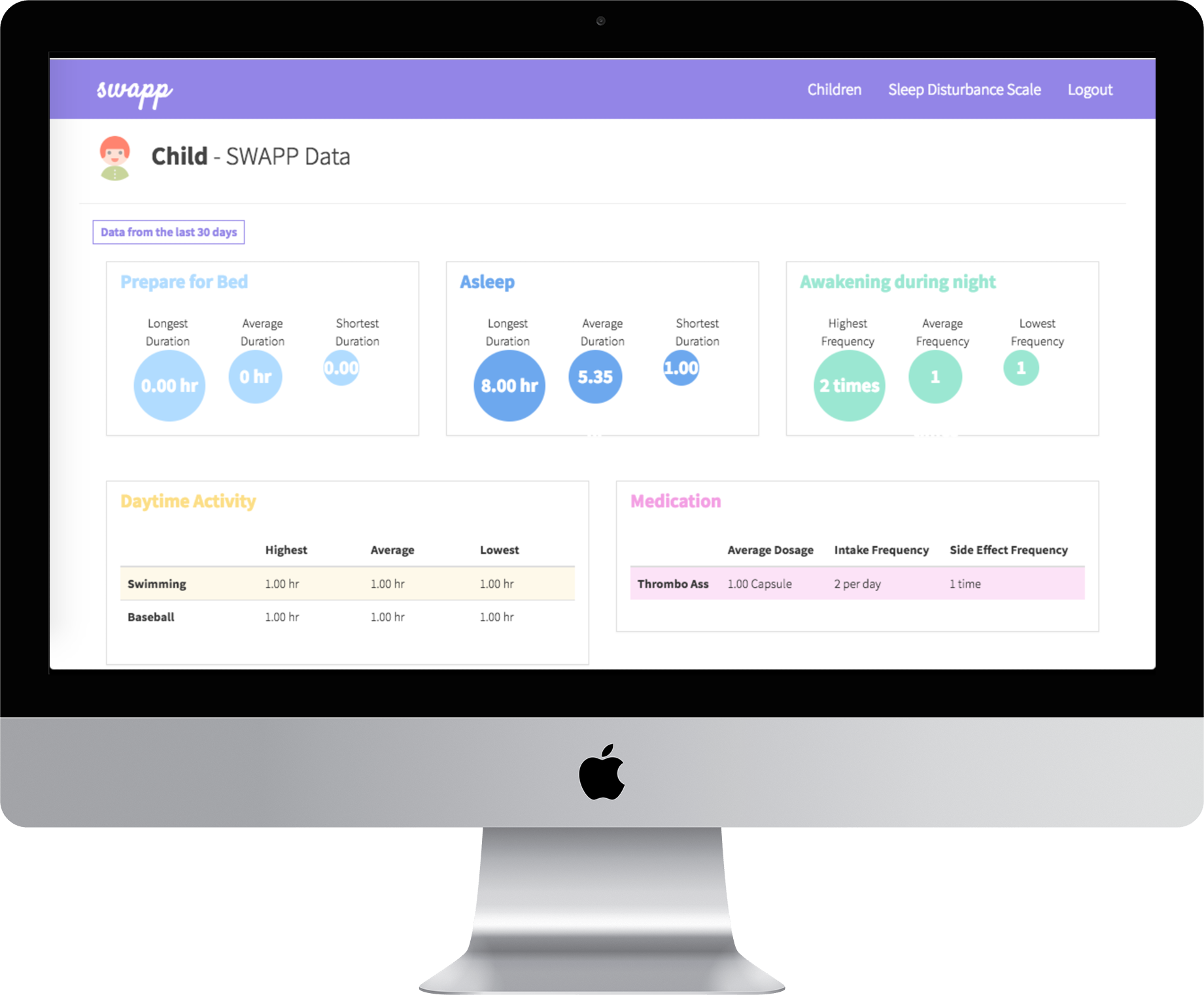 We created SWAPP to help parents and clinicians track a child’s behaviours. The app adopts a user-centered approach to collecting information, allowing parents to ‘own their data’ and individualize what they keep track of on a long-term bases, while also tracking short-term data that is requested by a clinician — such as positive or negative effects of a prescribed medication — allowing for immediate follow up, if necessary.