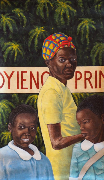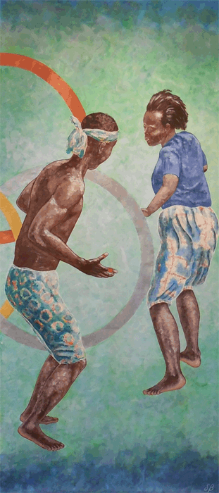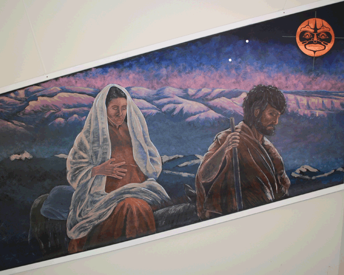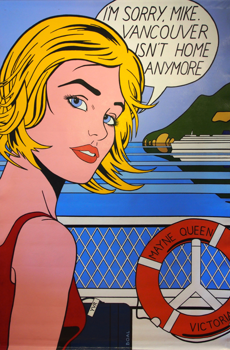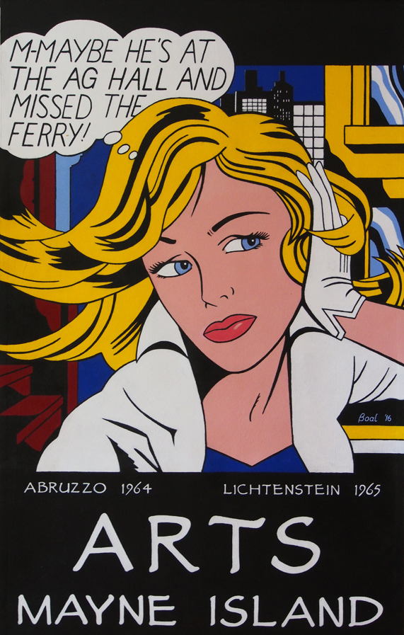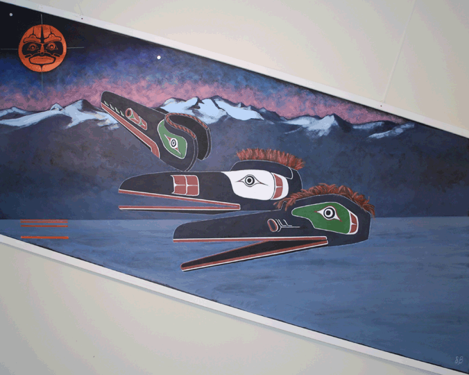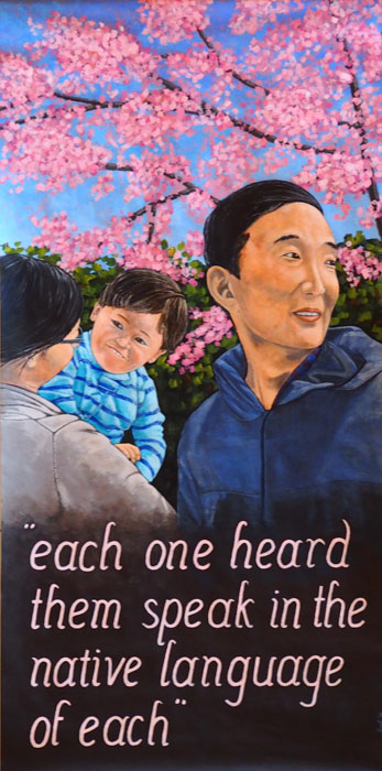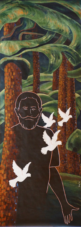 The challenge to the artist in creating large-scale pieces is making the work visually comprehensible from distances of up to 100 feet, much greater than what would be faced in most commercial galleries. The art show banners displayed here were prepared for shows on Mayne Island; the liturgical banners were displayed at churches on Vancouver's North Shore. Please click on an image for a more detailed description.