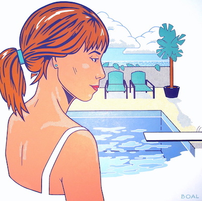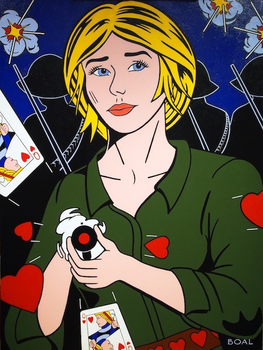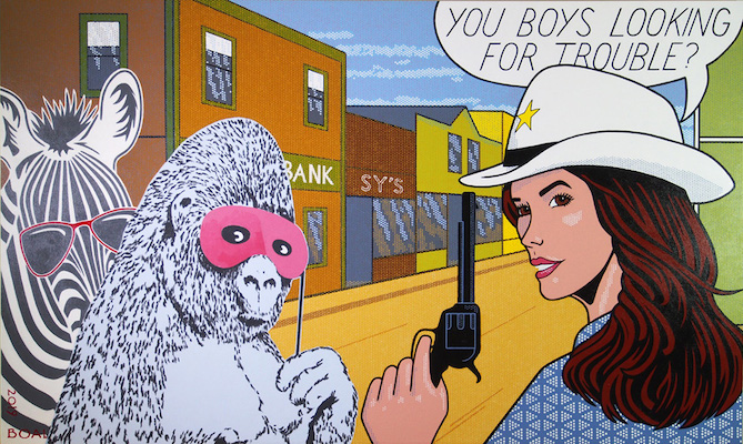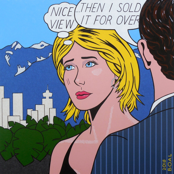 Although the nuances available in the realist style are compelling, I also enjoy the boldness and universality of pop art. Some of the paintings shown here use a primary colour palette, others use a broader range of colours and size of elements like benday dots. These works are done in acrylic and are typically six to twenty square feet in size. Please click on an image to enlarge it.