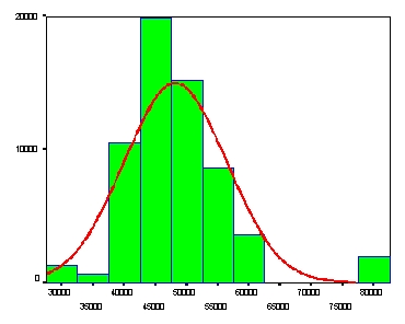 Consider first the descriptive statistics in Table 3. The grid coverages can basically be divided into two groups based on the statistics. The first group is those grids having cell size ranging from 10m to 500m and the rest three grids go to the second group. They are grouped this way is because the statistics for these grids are quite homogeneous. Within the first group the minimum and maximum are the same, the mean and standard deviation do not fluctuate too much, and this holds for skewness and kurtosis as well. However distribution of values of the grids in the first group are slightly positively skewed and having a longer tail than normal distribution, as shown by the skewness and kurtosis measures. This is because of the extreme value as shown on the graph next page. This graph shows the distribution of values of grid with cell size equals 10 with the red curve showing the normal distribution (all distribution graphs are having approximately the same shape in the first group). Beside the extreme value, the distribution seems to be quite normally distributed.