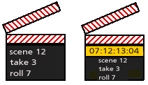 When the clapper hits the bottom portion it makes a clear snapping sound. This impulse is synchronized to the first frame which contains the image of the two parts touching. There are electronic versions of this device which provide timecode information as well. |
