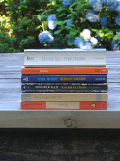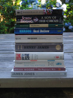 One last quick entry while we’re waiting for our ride to the airport. I mentioned books: it is not easy to select a mere several from a library of many many more. In the end weight and “disposability” won out: for each book that made the final cut, I had to be willing to leave it behind me somewhere on the road. And if you know me and books, you know this would not be easy for me to do. The Winners (left, bottom to top): Lord Jim (Joseph Conrad), South Wind (Norman Douglas), Invisible Man (Ralph Ellison), Speak, Memory (Vladimir Nabakov), Scoop (Evelyn Waugh), Winter’s Tale (Mark Helprin). Read along! The Runners-Up (right) I will leave to the sharp-eyed viewer to decipher. Official bookstore of this Camino tour: Macleod’s Books, at the corner of Pender and Richards in Vancouver. Shop early, shop often. To close: a big public (and yet anonymous) “Thankyou!” to M (of M & D fame) for being willing to take J & I and our bikes to the airport this morning. You go girl!
