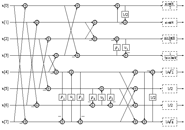 Fig. 2. General structure of the binDCT family based on Loeffler's factorization of the DCT.