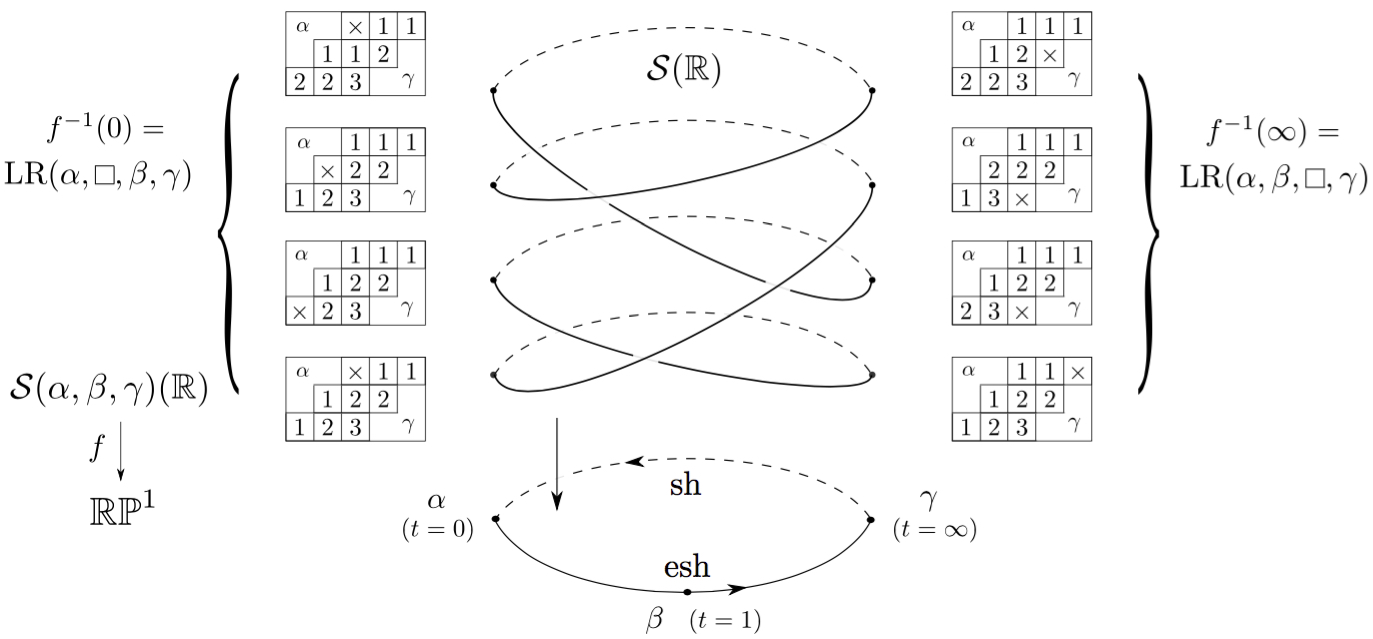 of the RP^1! The preimages of zero and infinity correspond to certain "semistandard Young tableaux" (the grids of numbers shown), and following the loop of the Schubert curve corresponds to moving the "x" square of the tableau according to a combinatorial algorithm.