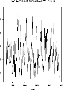 Built into S-Plus are two time series rain.nyc1 and rain.nyc2. These series are each supposed to be annual rain falls in New York in inches. Here is a plot of the series: