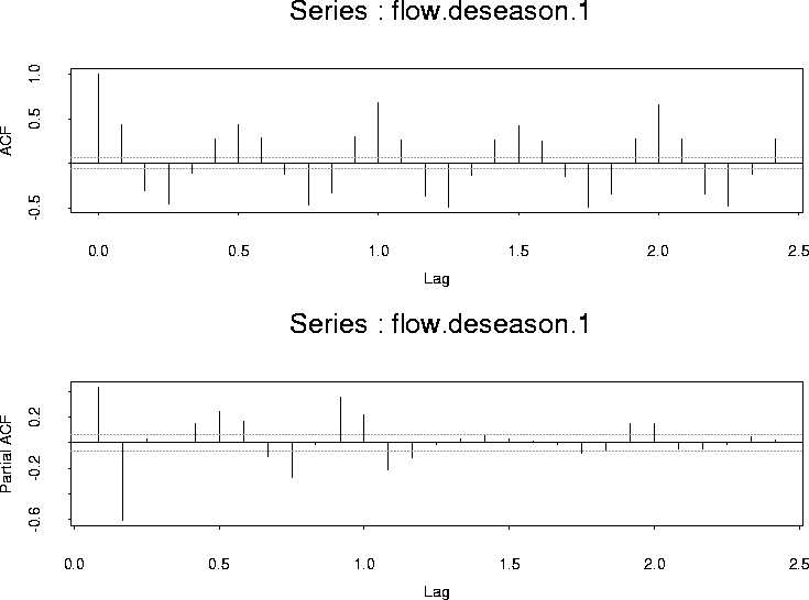 xr <- cbind(rep(1, n), cos((2 * pi * (1:n))/12), sin((2 * pi * (1:n))/12)) fit.0 <- lm(flow ~ xr -1) # This fits a linear model with no intercept since I # put the column of 1's into xr. There is no allowance for the # time series structure yet. flow.deseason.1 <- residuals(fit.0) # stores the residuals