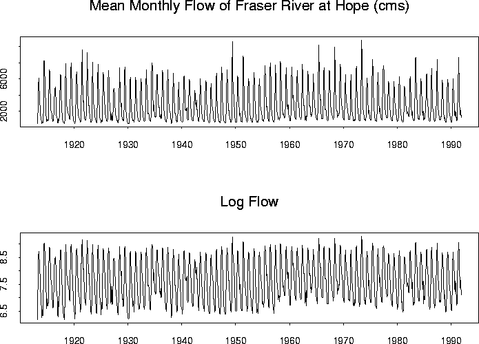 A data set measuring mean monthly Fraser River flows in cubic meters per second at Hope each month is available through statlib. Here is a plot of the series: