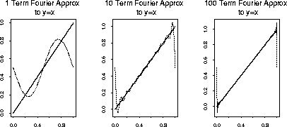This result says that a Fourier series is the best possible approximation to a function f by a trigonometric polynomial of this type. However, the conclusion depends quite heavily on how we measure the quality of approximation. Below are Fourier approximations to each of 3 functions on [0,1]: the line y=x, the quadratic y=x(1-x) and the square well y=1(x<0.25)+1(y>0.75). For each plot the pictures get better as K improves. However the well shaped plot shows effects of Gibb's phenomenon: near the discontinuity in f there is an overshoot which is very narrow and spiky. The overshoot is of a size which does not depend on the order of approximation.