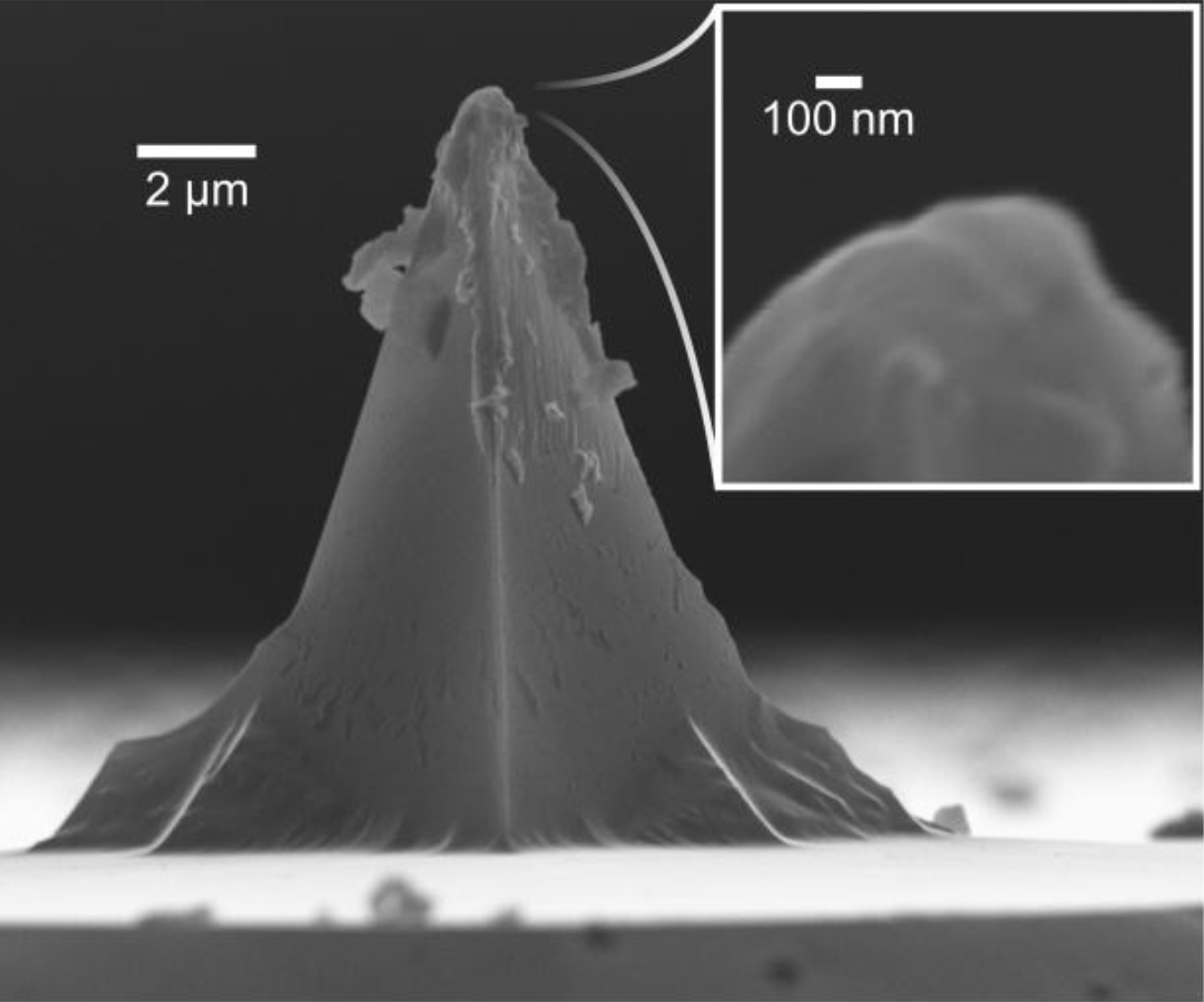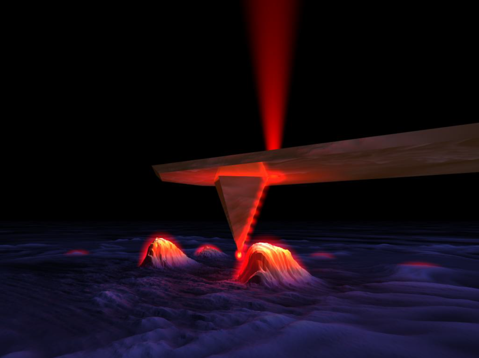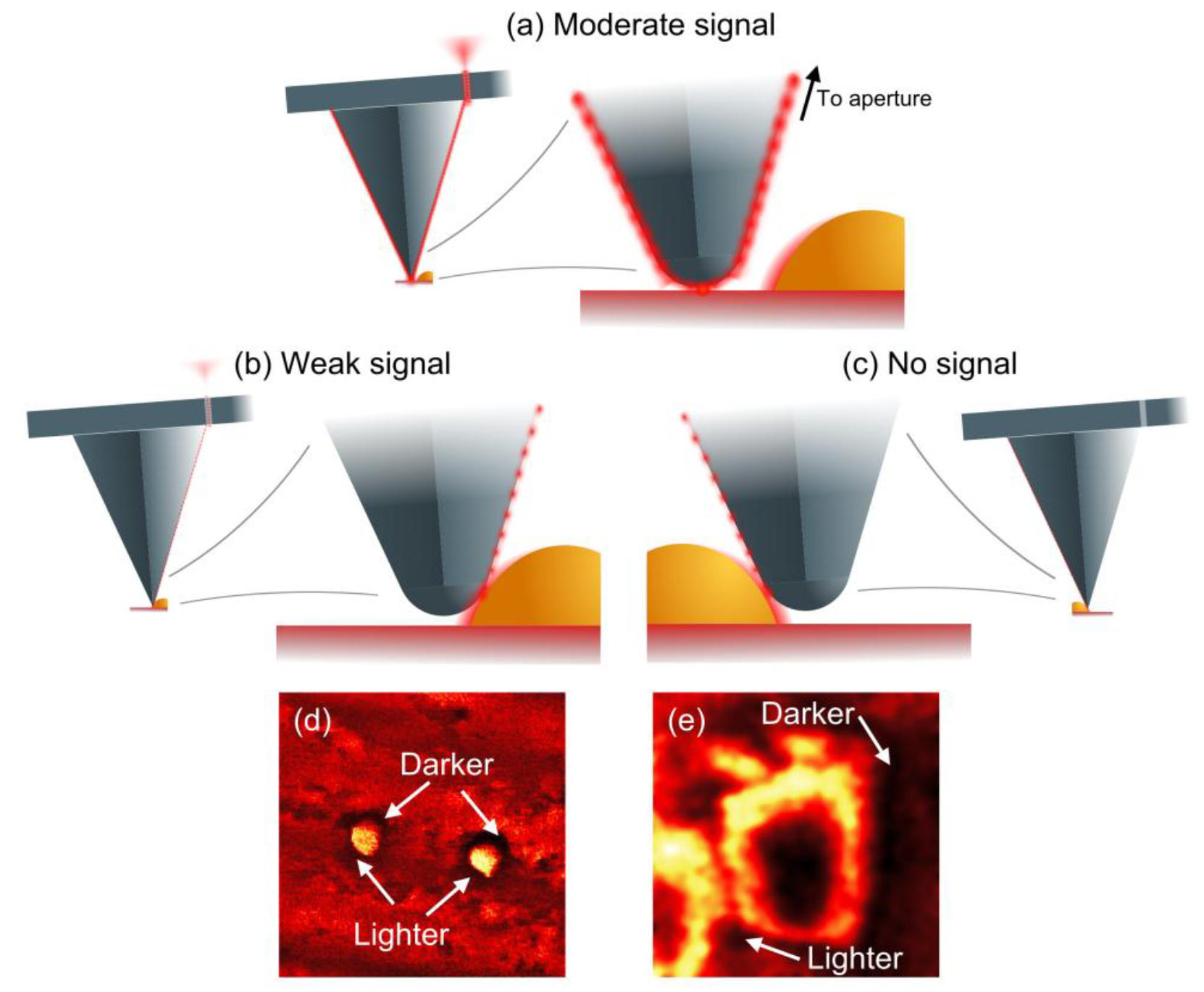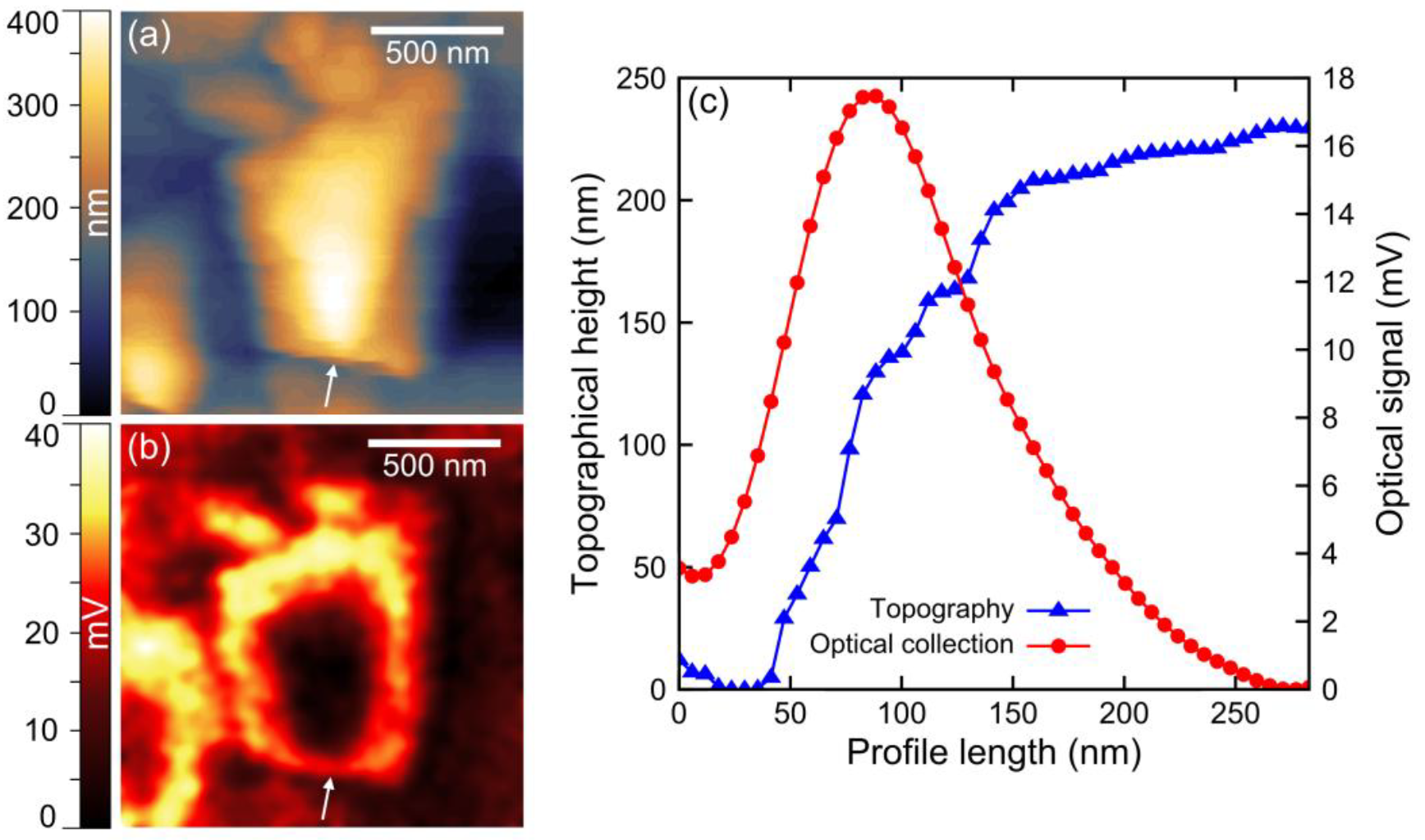 We demonstrate a nanoplasmonic probe that incorporates a subwavelength aperture coupled to a fine probing tip. This probe is used in a hybrid near-field scanning optical microscope and atomic force microscope system that can simultaneously map the optical near-field and the topography of nanostructures. By spatially isolating but optically coupling the aperture and the localizing point, we obtained near-field images at a resolution of 45 nm, corresponding to λ/14. This nanoplasmonic probe design overcomes the resolution challenges of conventional apertured near- field optical probes and can provide substantially higher resolution than demonstrated in this work.