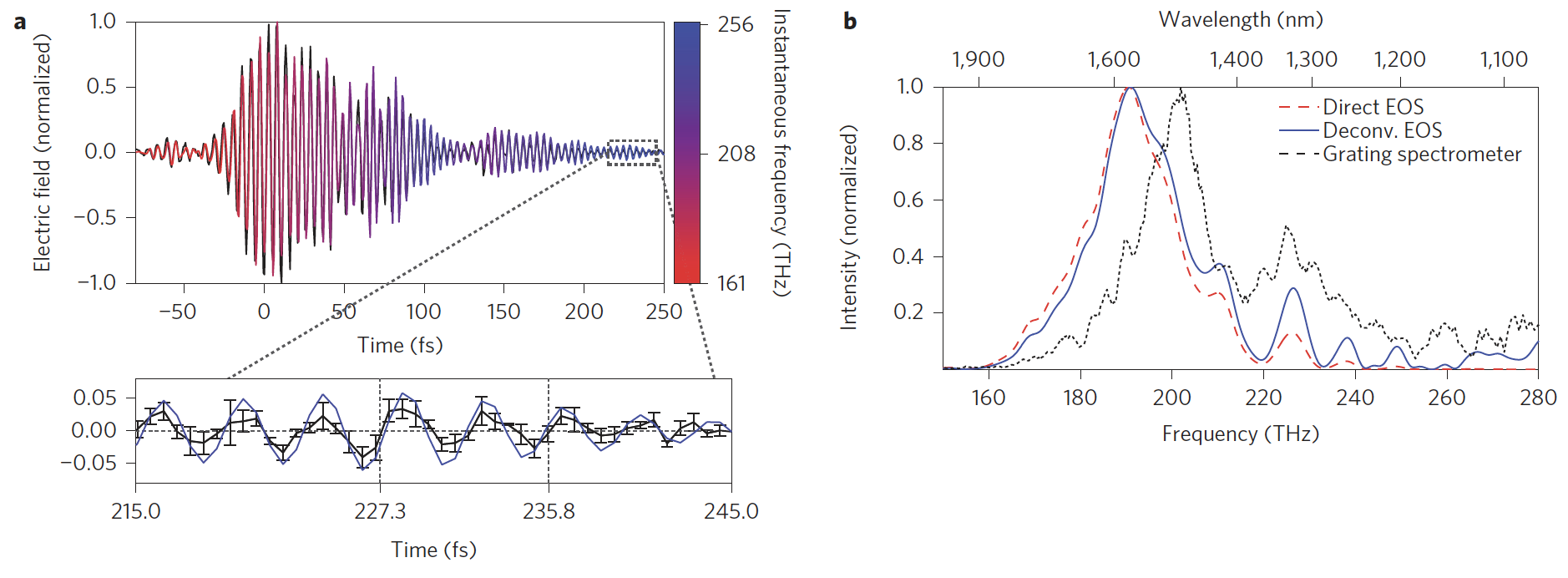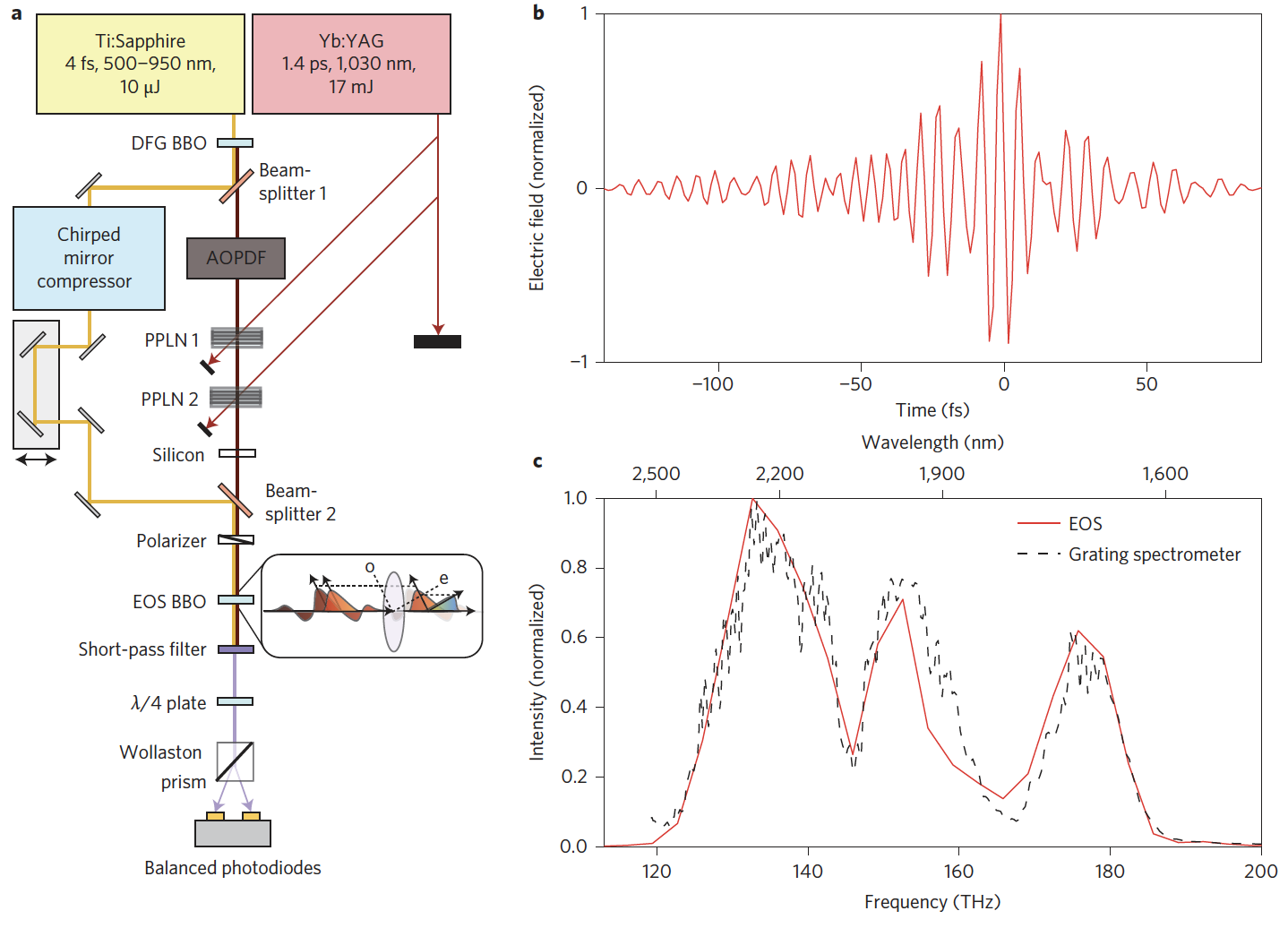 Access to the complete electric field evolution of a laser pulse is essential for attosecond science in general, and for the scrutiny and control of electron phenomena in solid-state physics specifically. Time-resolved field measurements are routine in the terahertz spectral range, using electro-optic sampling (EOS), photoconductive switches and field-induced second harmonic generation. EOS in particular features outstanding sensitivity and ease of use, making it the basis of time-resolved spectroscopic measurements for studying charge carrier dynamics and active optical devices. In this Letter, we show that careful optical filtering allows the bandwidth of this technique to be extended to wavelengths as short as 1.2 μm (230 THz) with half-cycle durations 2.3 times shorter than the sampling pulse. In a proof-of-principle application, we measure the influence of optical parametric amplification (OPA) on the electric field dynamics of a few-cycle near-infrared (NIR) pulse.