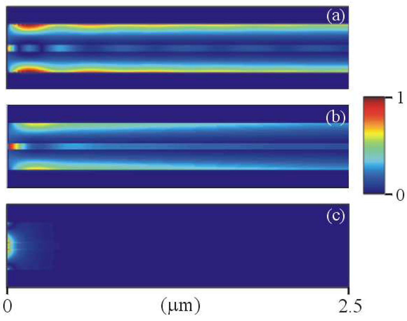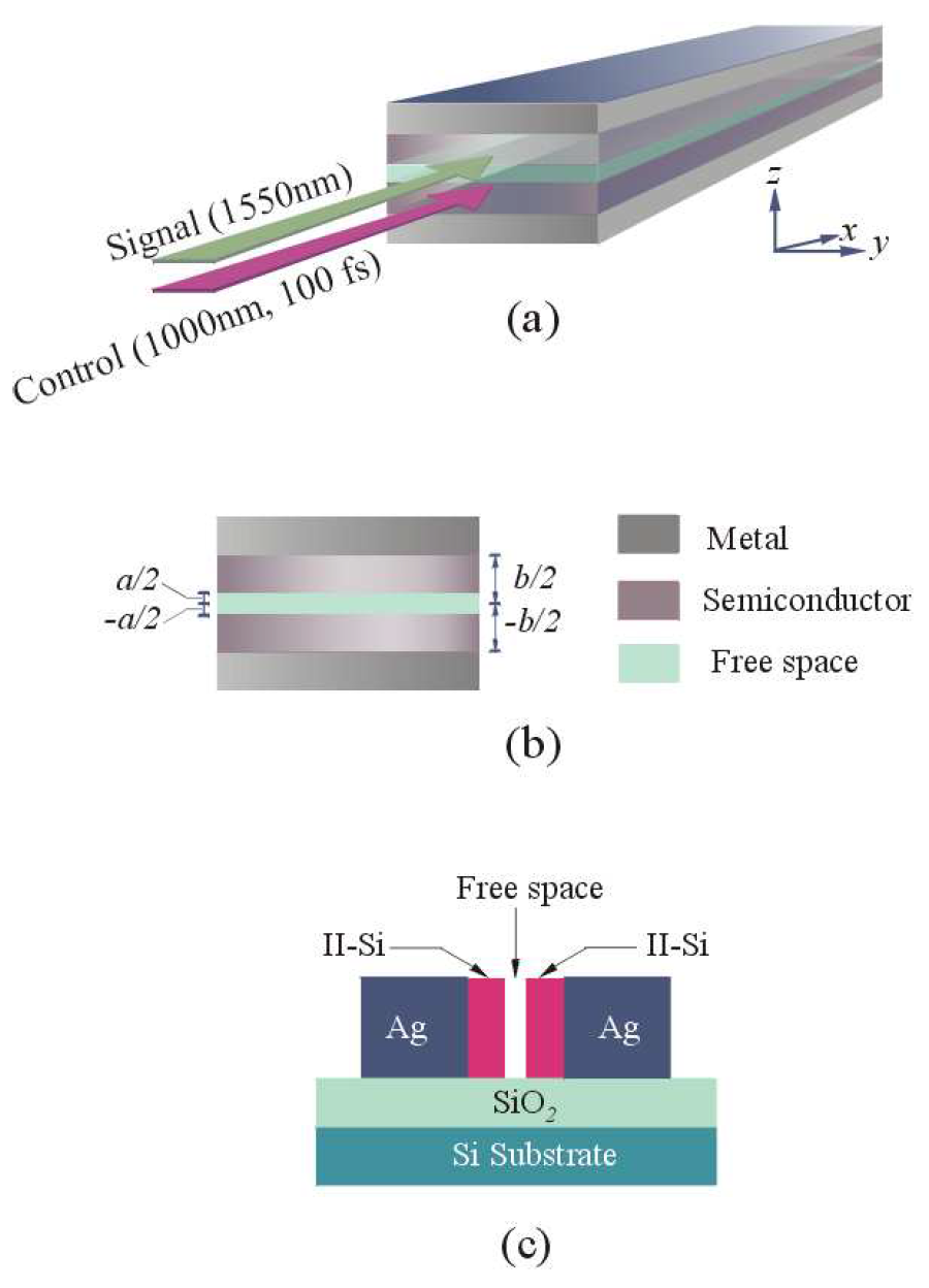 A five-layer silicon-based nanoplasmonic waveguiding structure is proposed for ultrafast all-optical modulation and switching applications. Ultrafast nonlinear phase and amplitude modulation is achieved via photo-generated free carrier dynamics in ion-implanted silicon using above-bandgap femtosecond pump pulses. Both an analytical model and rigorous numerical simulations of the structures have shown that a switching time of 5ps and an on-off contrast of 35dB can be achieved in these devices.