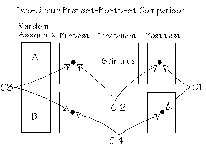With the pretest-posttest design, you can look at comparison 4 to see if there is any difference over time for the control group. If there is a difference here, it is not due to the experimental stimulus, since the members of this group do not receive the stimulus. Therefore, if you see a difference in this comparison, you should be concerned about what is causing it and what effect it will have on the experimental group as well.